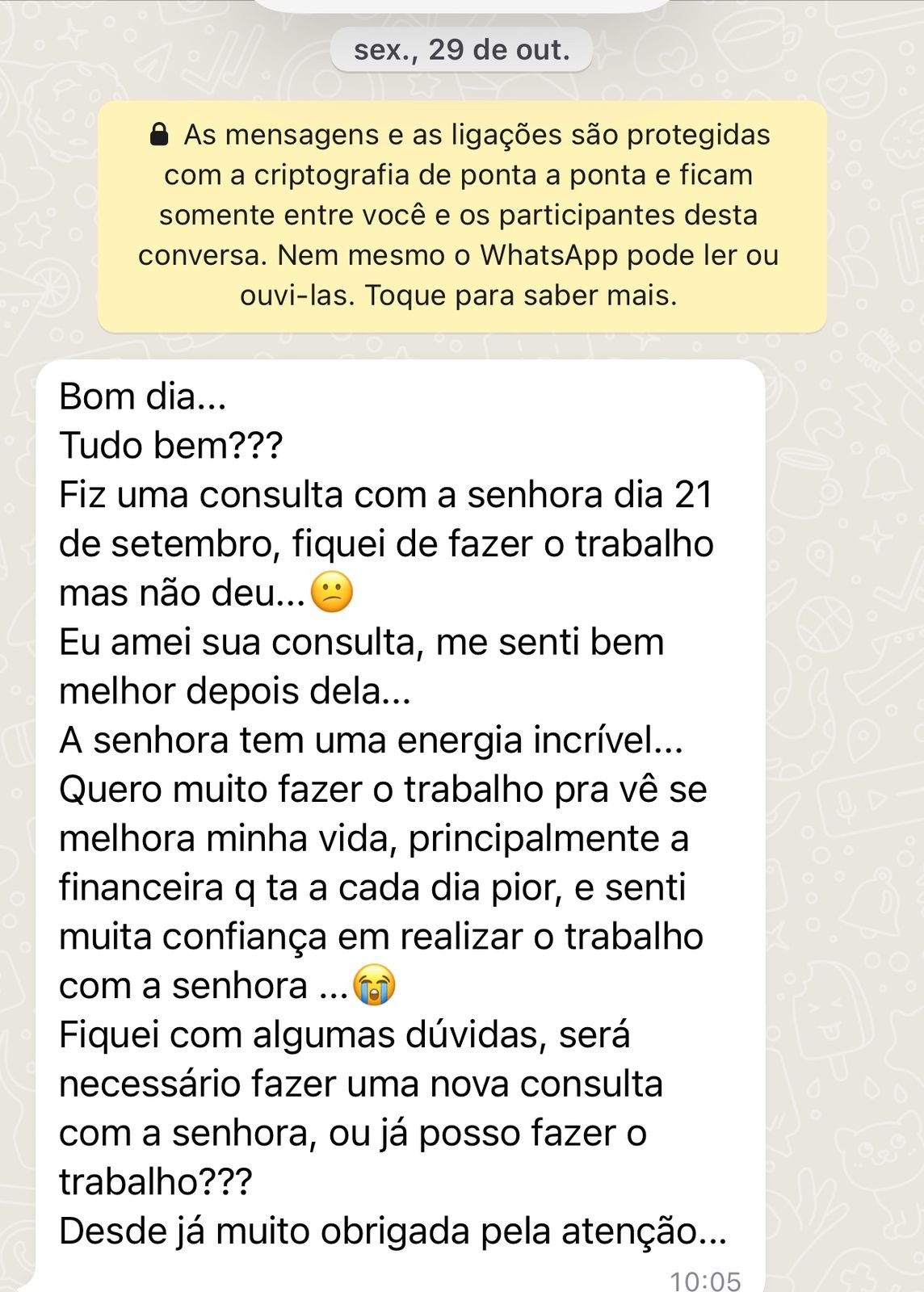 Sou Taróloga e Espiritualista dedicada a transformar vidas através da força da espiritualidade. Atendo com seriedade, sigilo e profundidade, oferecendo trabalhos especializados para união amorosa, abertura de caminhos, limpezas espirituais, quedas de feitiços, prosperidade, cura emocional e proteção energética. Com anos de experiência em trabalhos de luz, mesa branca e tradições do Candomblé, ajudo você a recuperar seu equilíbrio, conquistar seus objetivos e reconquistar aquilo que é seu por direito. Cada atendimento é único, feito com responsabilidade, conexão espiritual e compromisso com resultados reais.